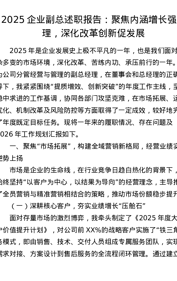 2025企业副总述职报告:聚焦内涵增长强管理,深化改革创新促发展
