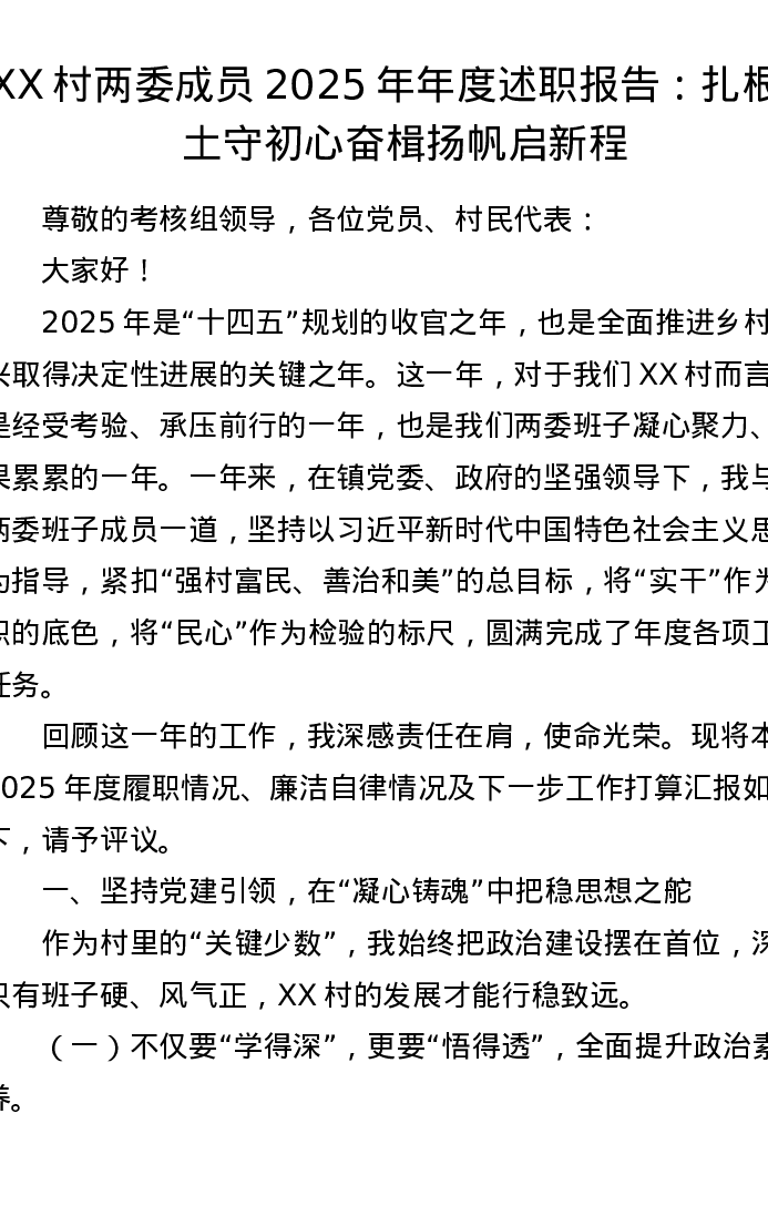 XX村两委成员2025年年度述职报告:扎根泥土守初心 奋楫扬帆启新程