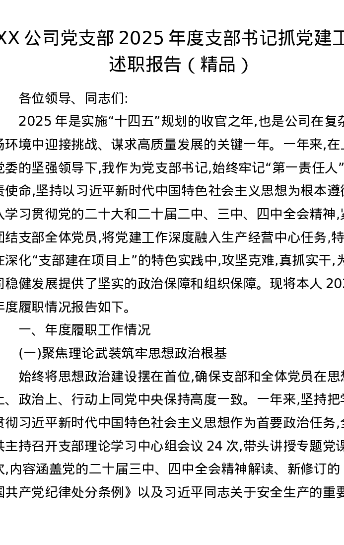 XX公司党支部2025年度支部书记抓党建工作述职报告