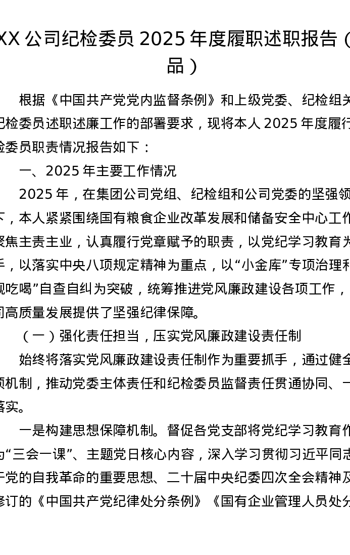 XX公司纪检委员2025年度履职述职报告(精品)