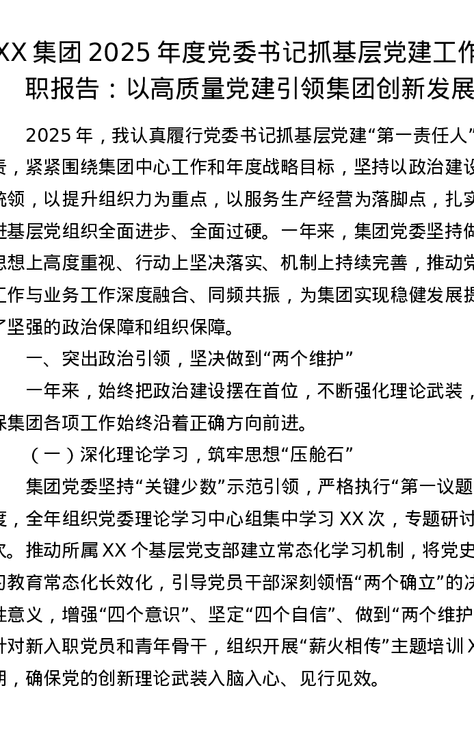 XX集团2025年度党委书记抓基层党建工作述职报告:以高质量党建引领集团创新发展