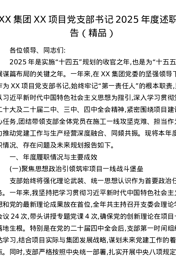 XX集团XX项目党支部书记2025年度述职报告