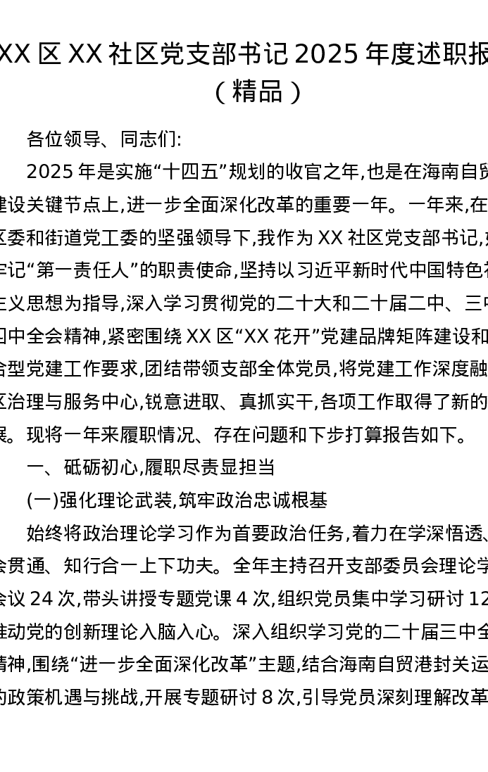 XX区XX社区党支部书记2025年度述职报告