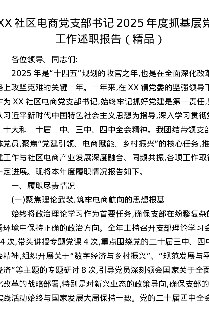 XX社区电商党支部书记2025年度抓基层党建工作述职报告