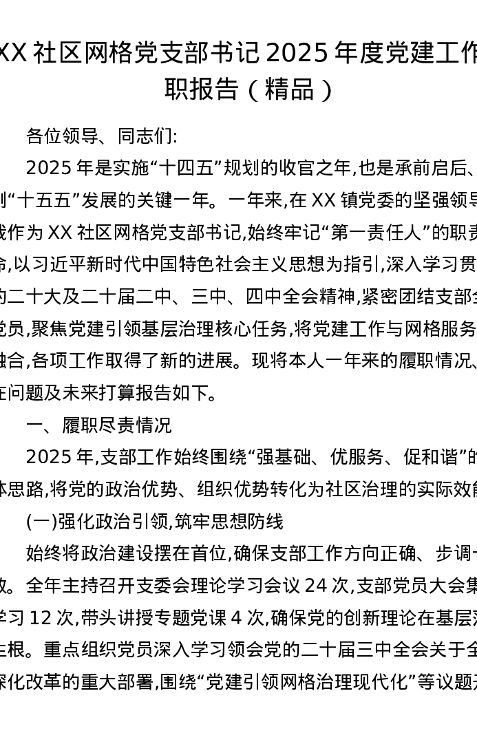 XX社区网格党支部书记2025年度党建工作述职报告