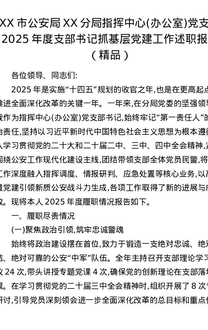 XX市公安局XX分局指挥中心(办公室)党支部2025年度支部书记抓基层党建工作述职报告