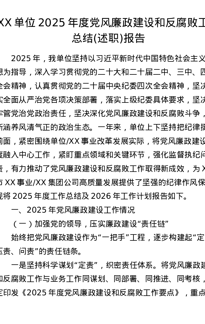 单位2025年度党风廉政建设和反腐败工作总结(述职)报告