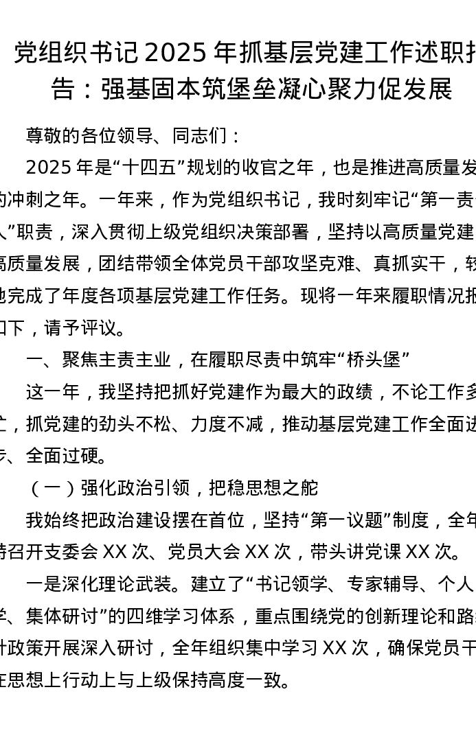 党组织书记2025年抓基层党建工作述职报告:强基固本筑堡垒 凝心聚力促发展