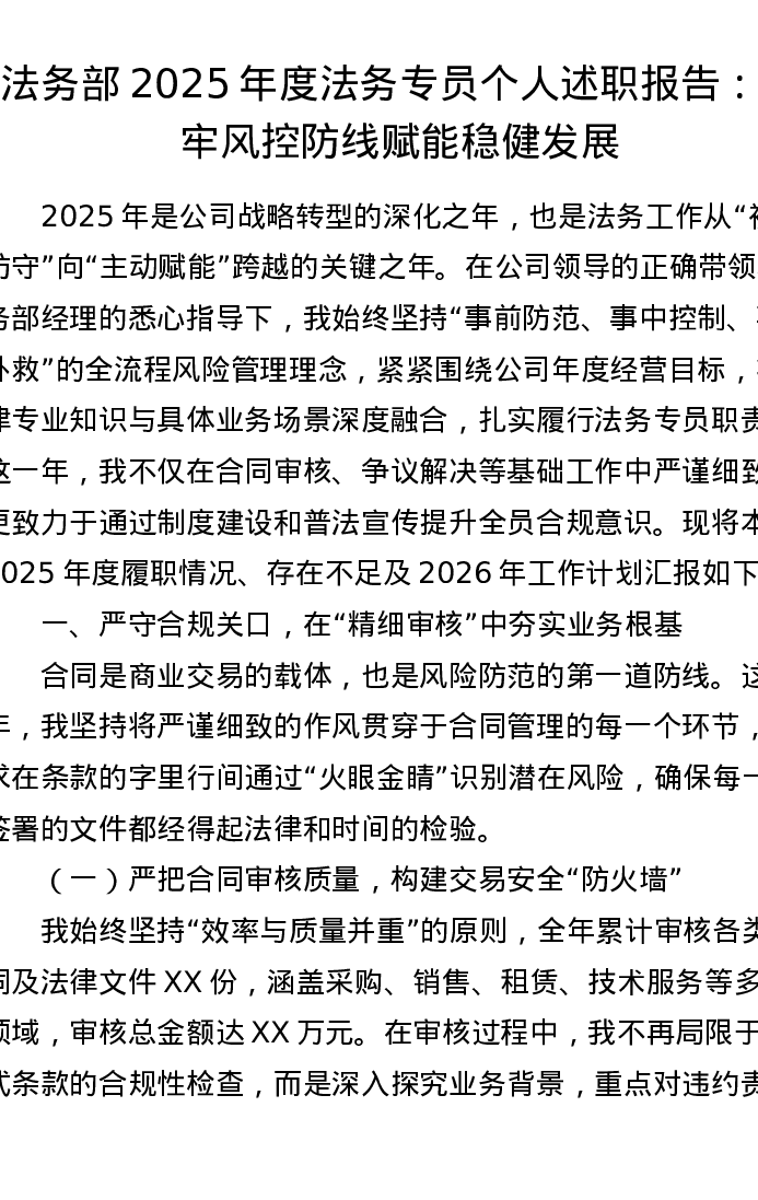 法务部2025年度法务专员个人述职报告:筑牢风控防线 赋能稳健发展