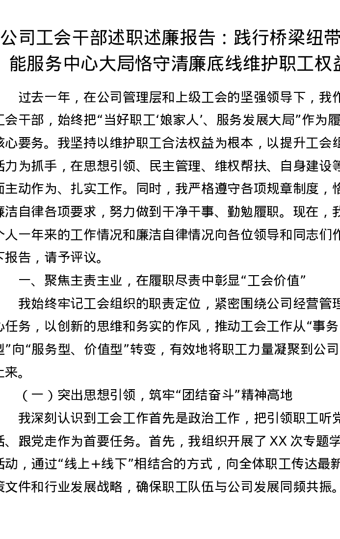 公司工会干部述职述廉报告:践行桥梁纽带职能服务中心大局 恪守清廉底线维护职工权益