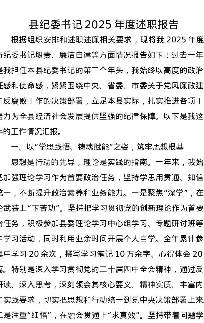 县纪委书记2025年度述职报告