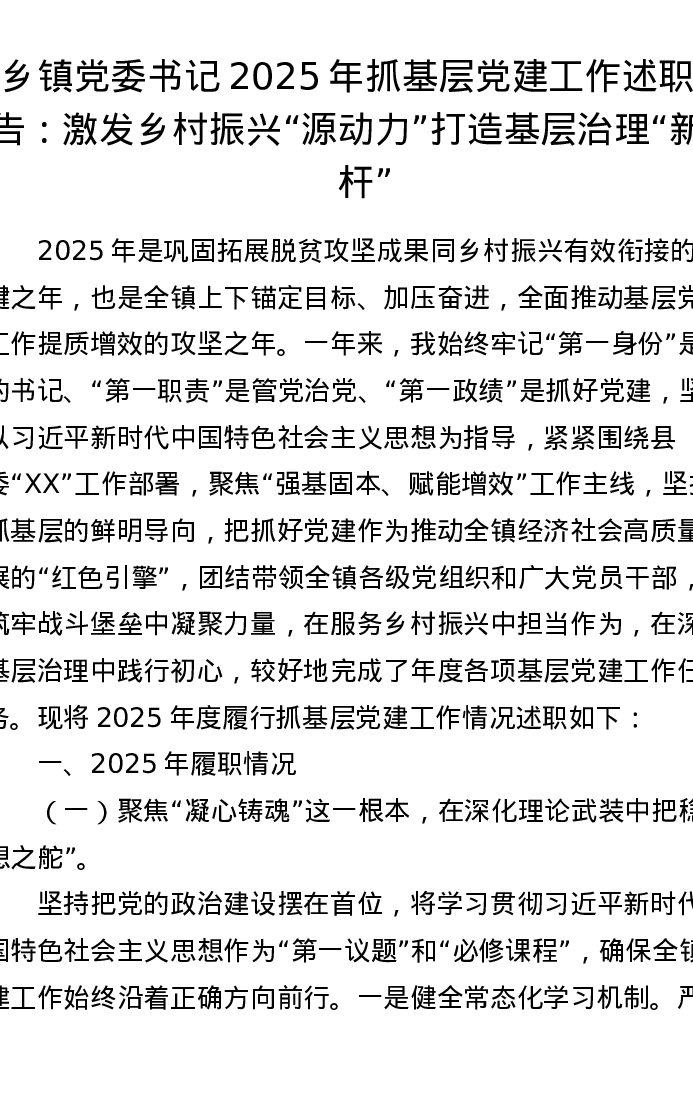 乡镇党委书记2025年抓基层党建工作述职报告:激发乡村振兴“源动力” 打造基层治理“新标杆”