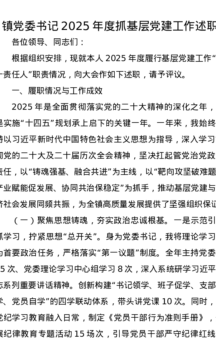 镇党委书记2025年度抓基层党建工作述职
