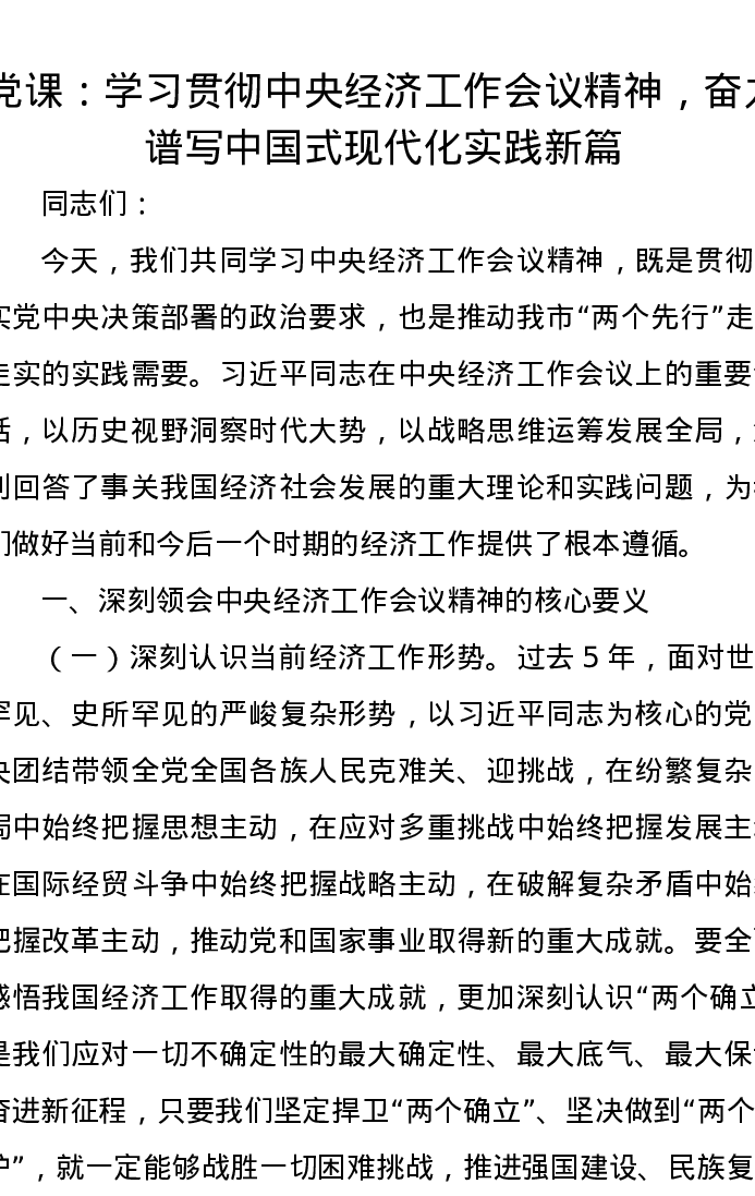 党课讲稿:学习贯彻中央经济工作会议精神,奋力谱写中国式现代化实践新篇