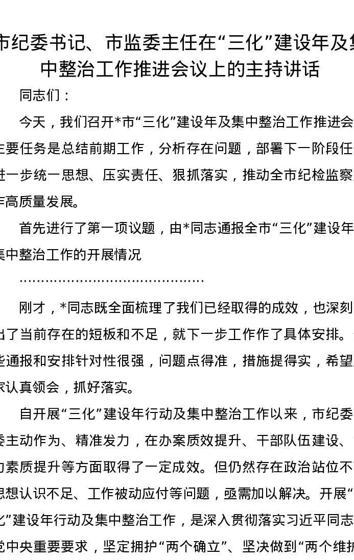 市纪委书记、市监委主任在“三化”建设年及集中整治工作推进会议上的主持讲话
