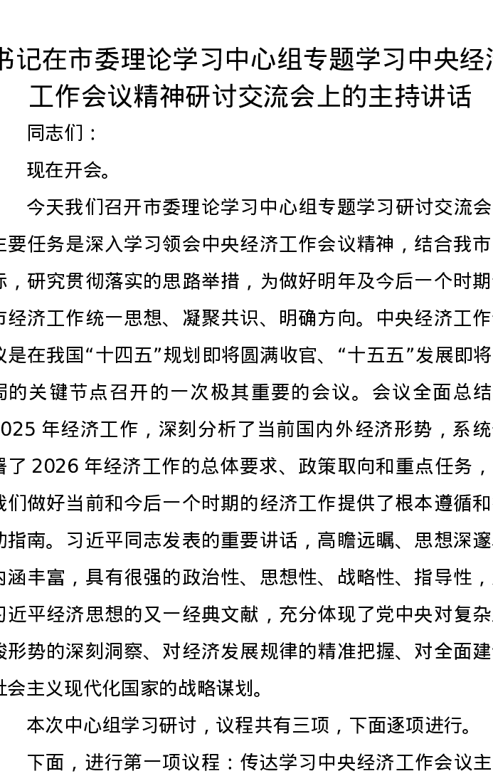 书记在市委理论学习中心组专题学习中央经济工作会议精神研讨交流会上的主持讲话