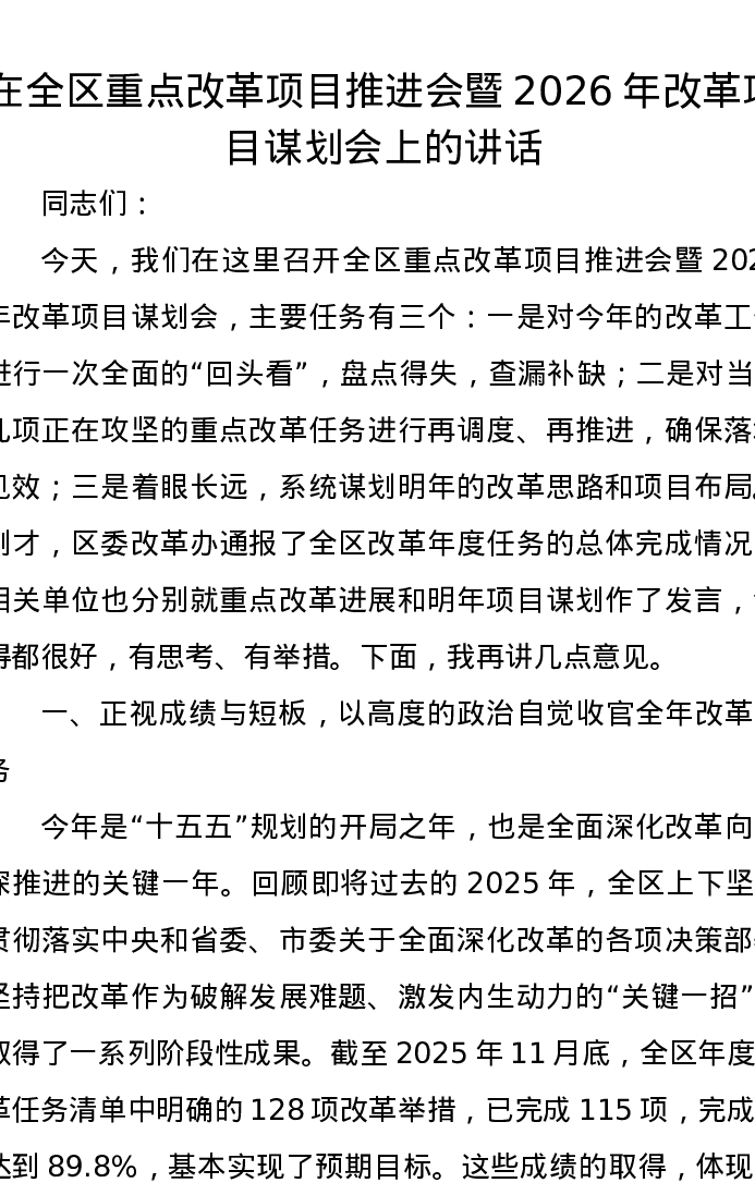 在全区重点改革项目推进会暨2026年改革项目谋划会上的讲话