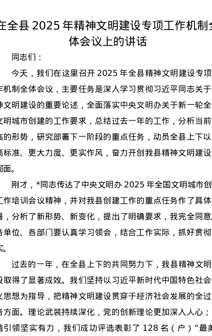 在全县2025年精神文明建设专项工作机制全体会议上的讲话