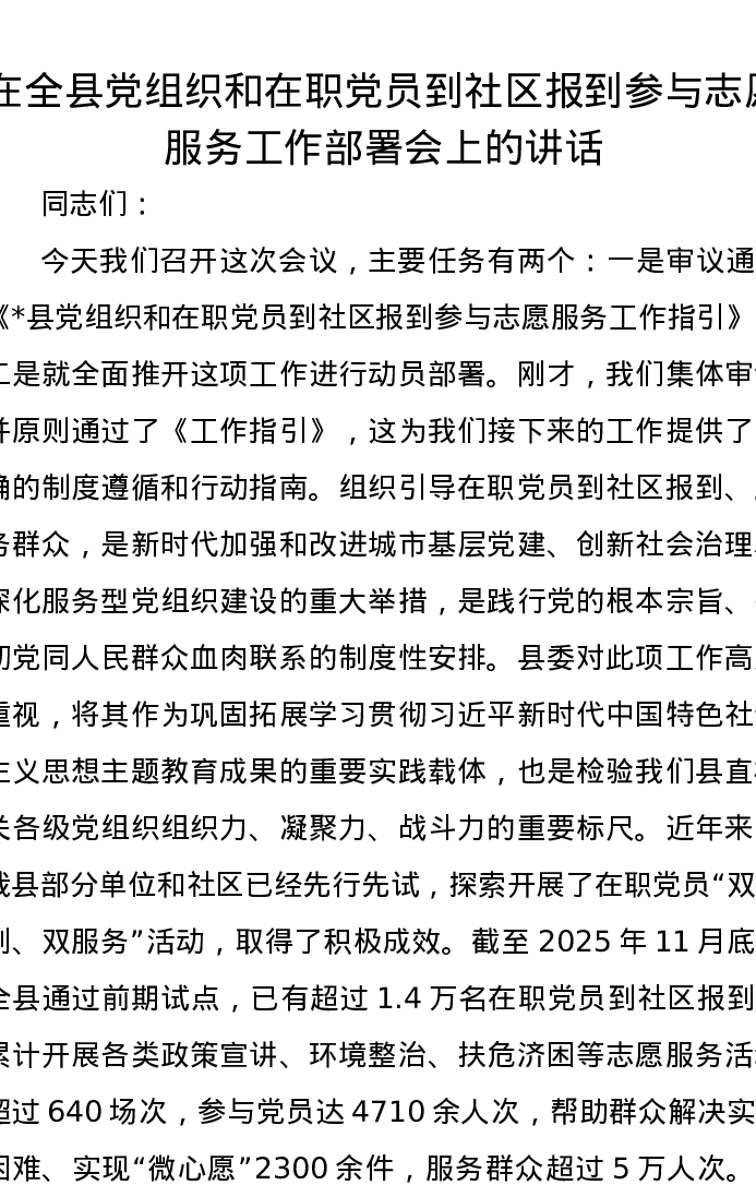 在全县党组织和在职党员到社区报到参与志愿服务工作部署会上的讲话