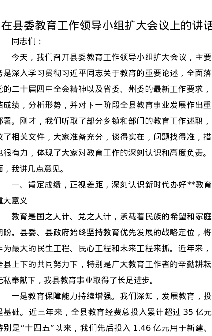 在县委教育工作领导小组扩大会议上的讲话