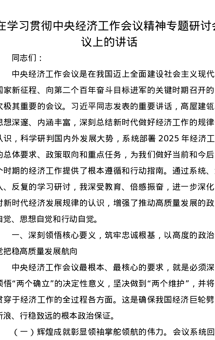 在学习贯彻中央经济工作会议精神专题研讨会议上的讲话