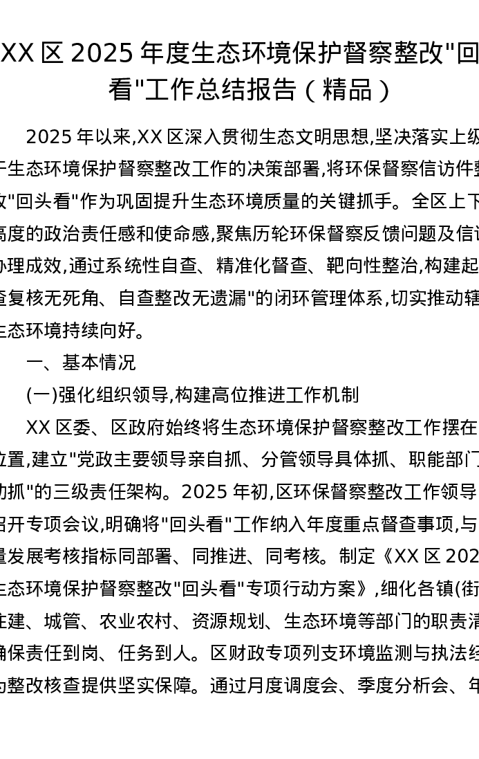 XX区2025年度生态环境保护督察整改“回头看”工作总结报告