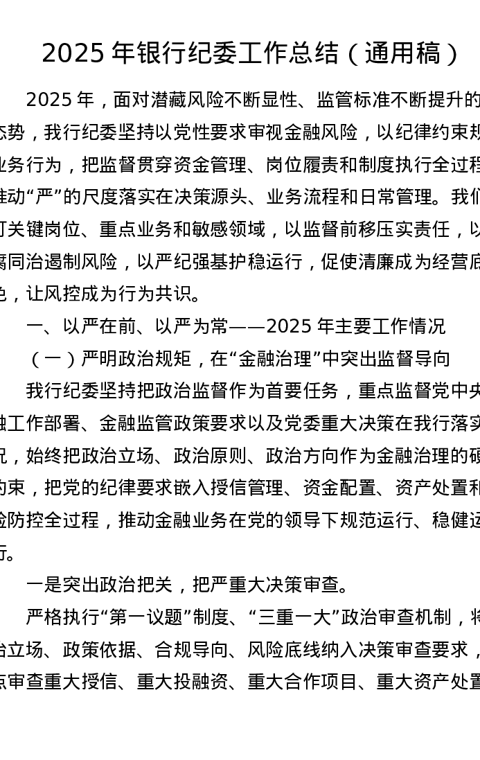2025年银行纪委工作总结(通用稿)