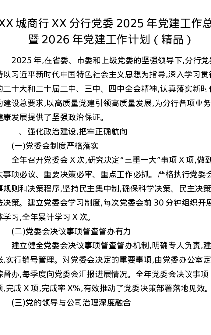 XX城商行XX分行党委2025年党建工作总结暨2026年党建工作计划