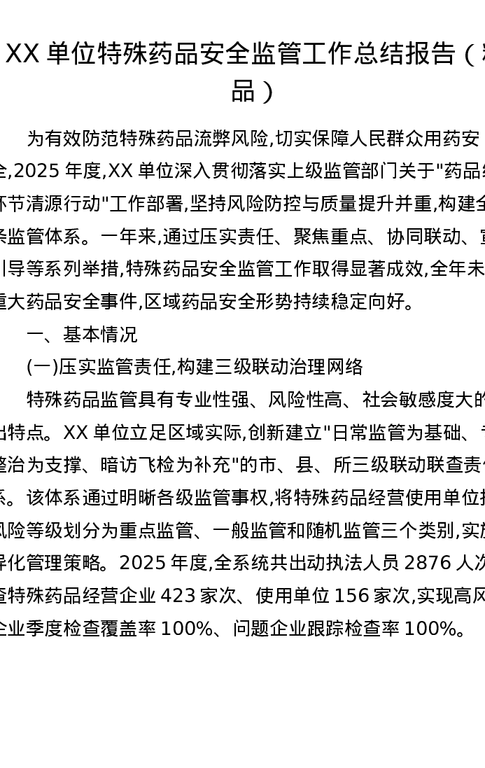 XX单位特殊药品安全监管工作总结报告