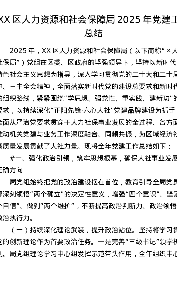 XX区人力资源和社会保障局2025年党建工作总结(3965字)