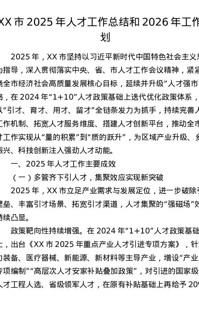 XX市2025年人才工作总结和2026年工作计划(6913字)