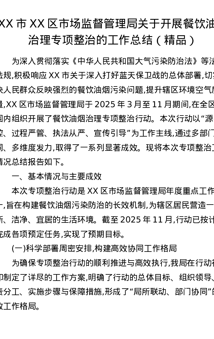 XX市XX区市场监督管理局关于开展餐饮油烟治理专项整治的工作总结