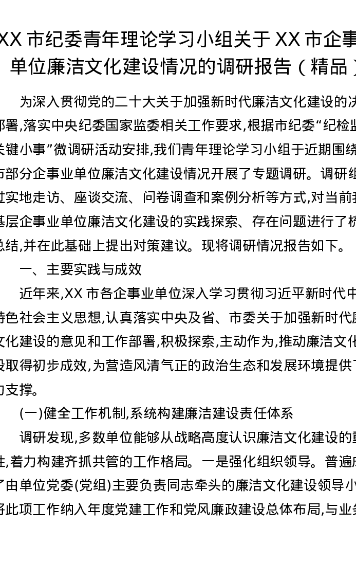 XX市纪委青年理论学习小组关于XX市企事业单位廉洁文化建设情况的调研报告