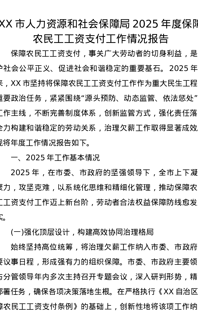 XX市人力资源和社会保障局2025年度保障农民工工资支付工作情况报告