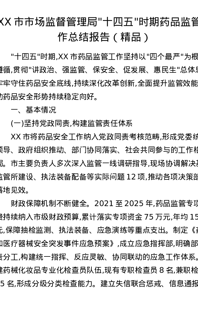 XX市市场监督管理局“十四五”时期药品监管工作总结报告