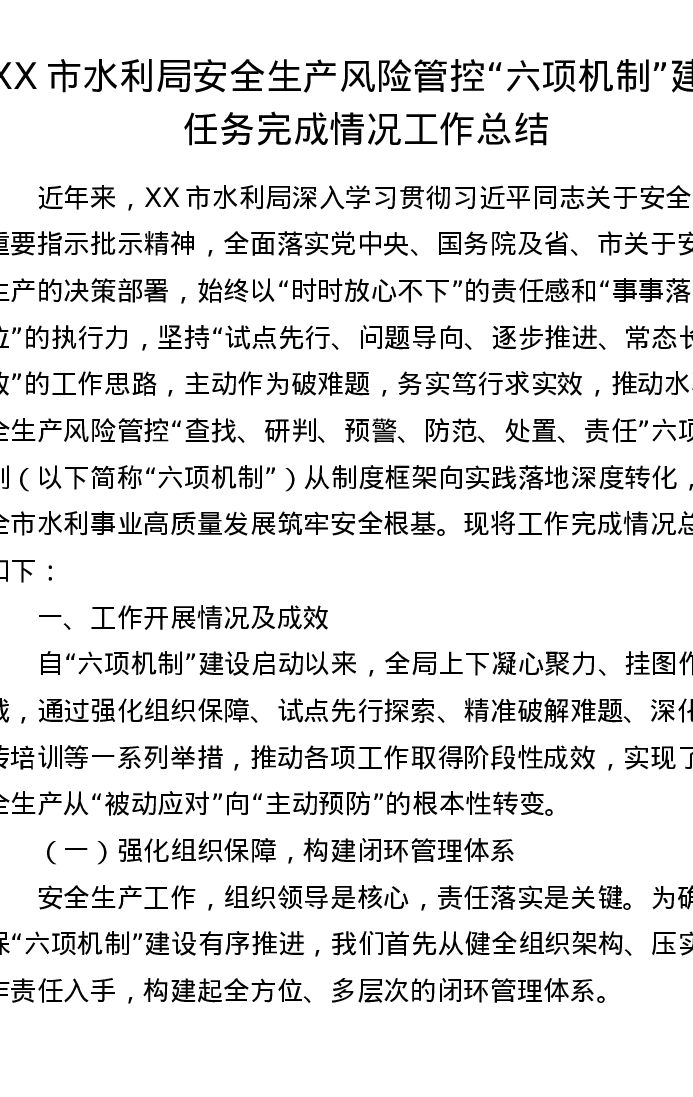 XX市水利局安全生产风险管控“六项机制”建设任务完成情况工作总结