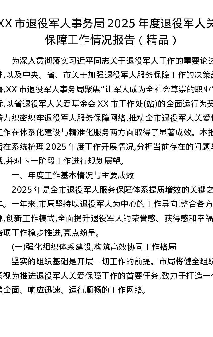 XX市退役军人事务局2025年度退役军人关爱保障工作情况报告