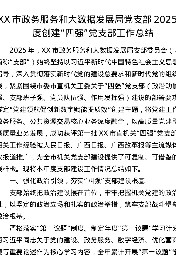 XX市政务服务和大数据发展局党支部2025年度创建“四强”党支部工作总结(4791字)