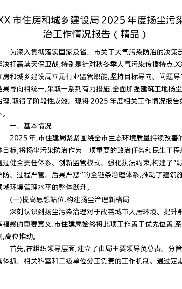 XX市住房和城乡建设局2025年度扬尘污染防治工作情况报告