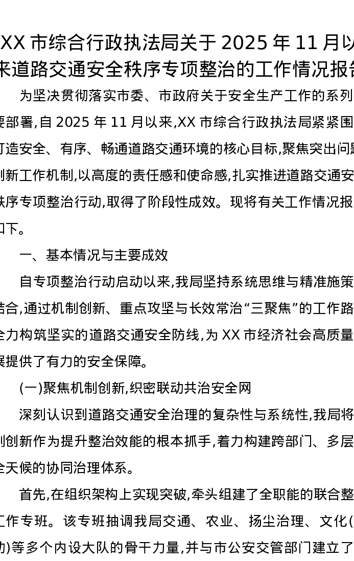 XX市综合行政执法局关于2025年11月以来道路交通安全秩序专项整治的工作情况报告