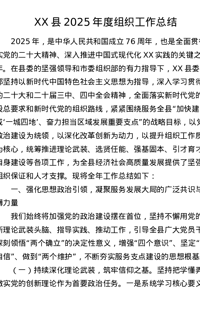XX县2025年度组织工作总结(7113字)