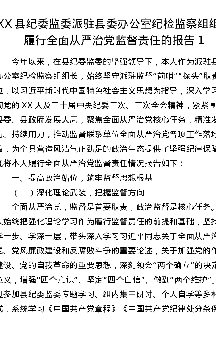 XX县纪委监委派驻县委办公室纪检监察组组长履行全面从严治党监督责任的报告1