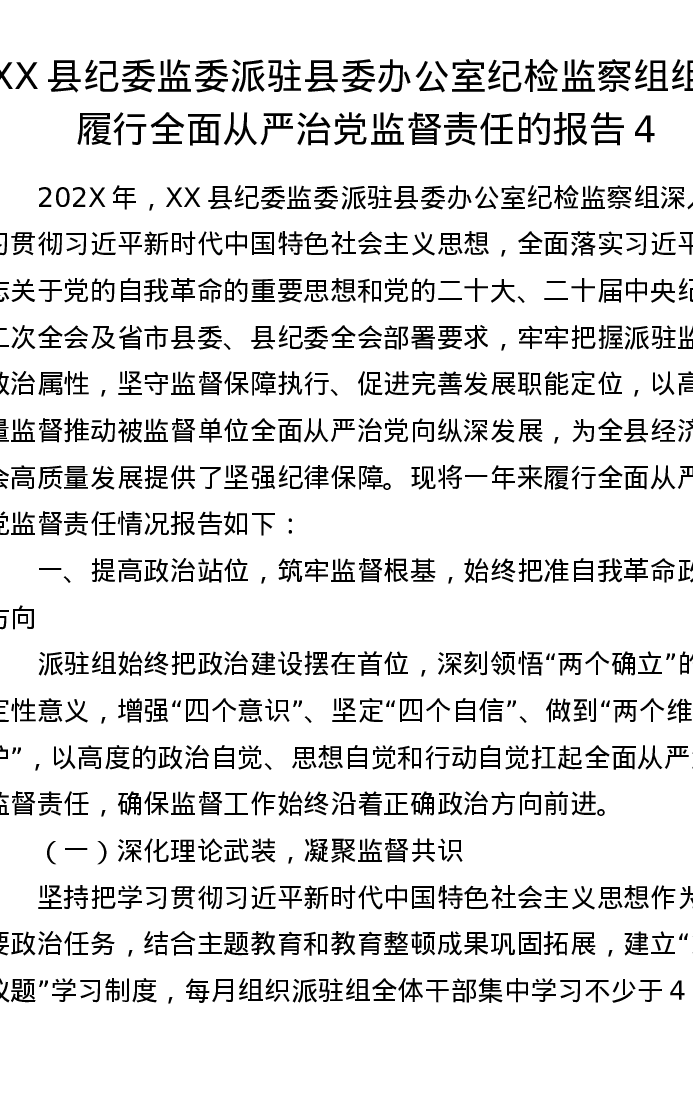 XX县纪委监委派驻县委办公室纪检监察组组长履行全面从严治党监督责任的报告4