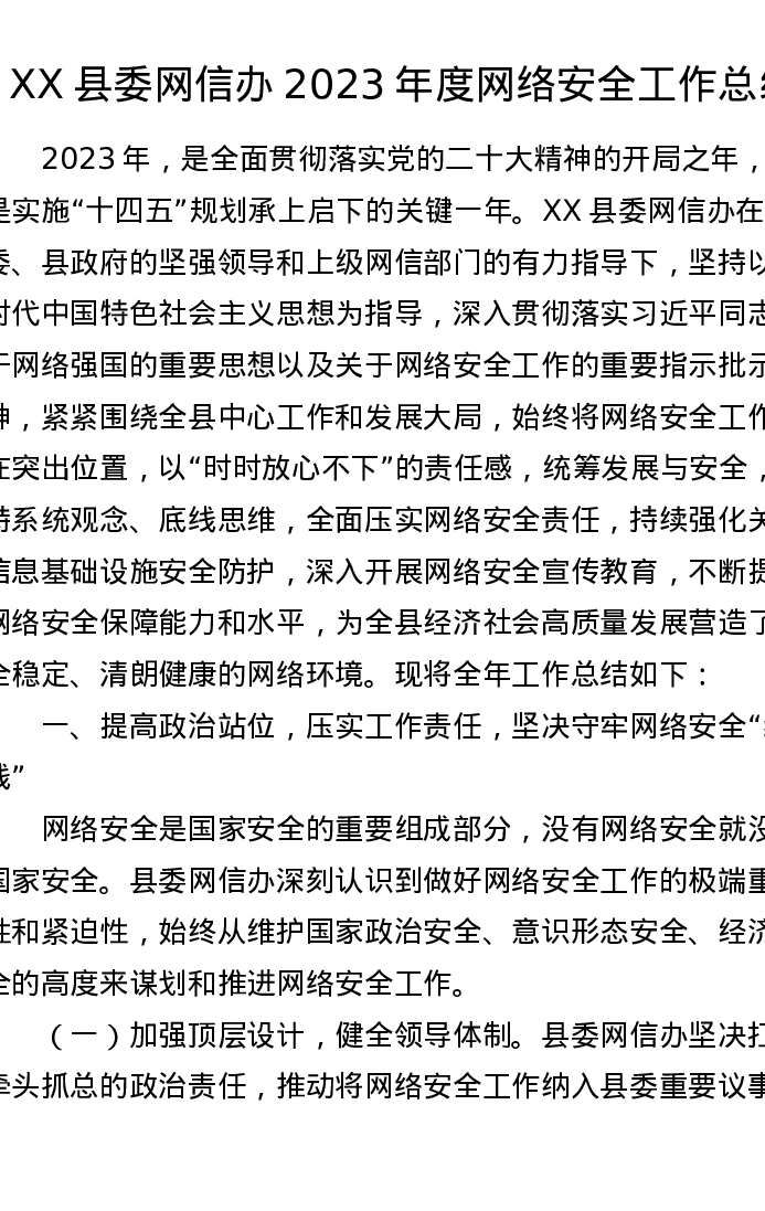 XX县委网信办网络安全工作总结