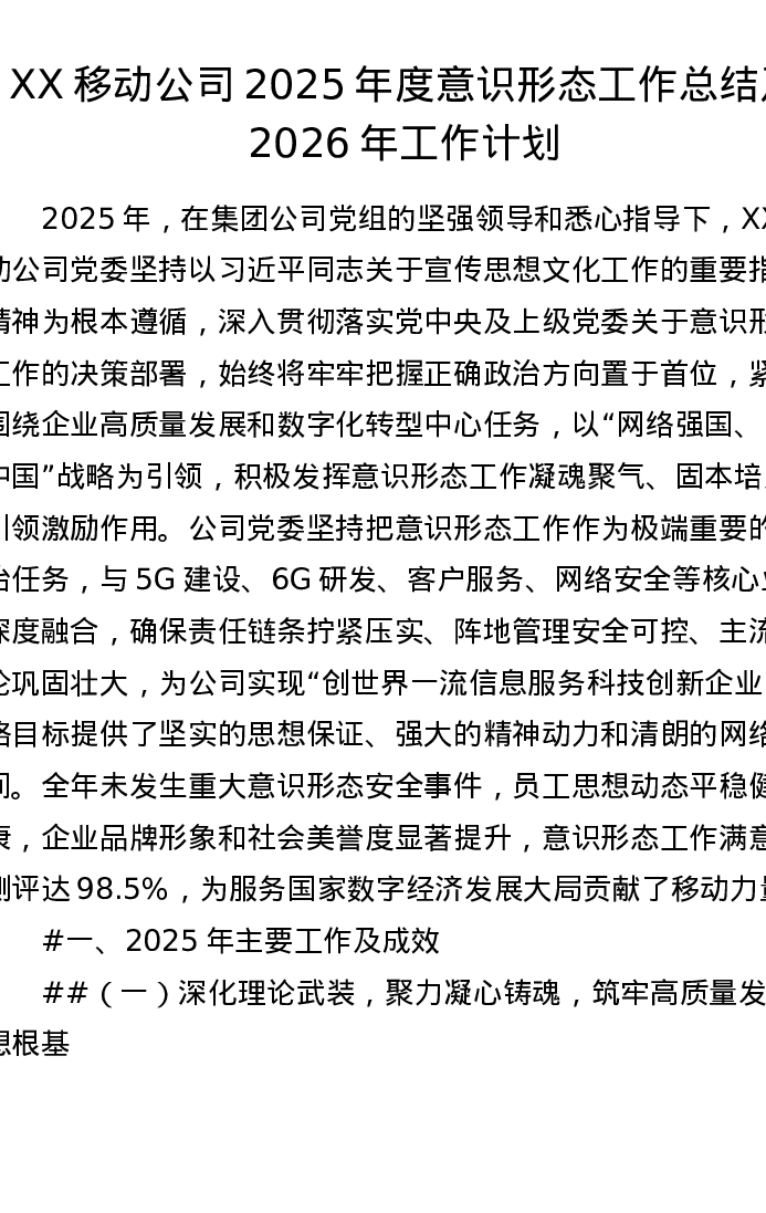 XX移动公司2025年度意识形态工作总结及2026年工作计划(6953字)