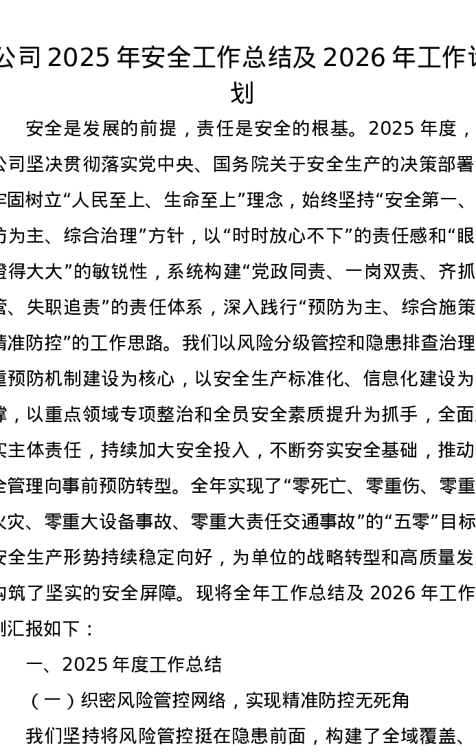 公司2025年安全工作总结及2026年工作计划