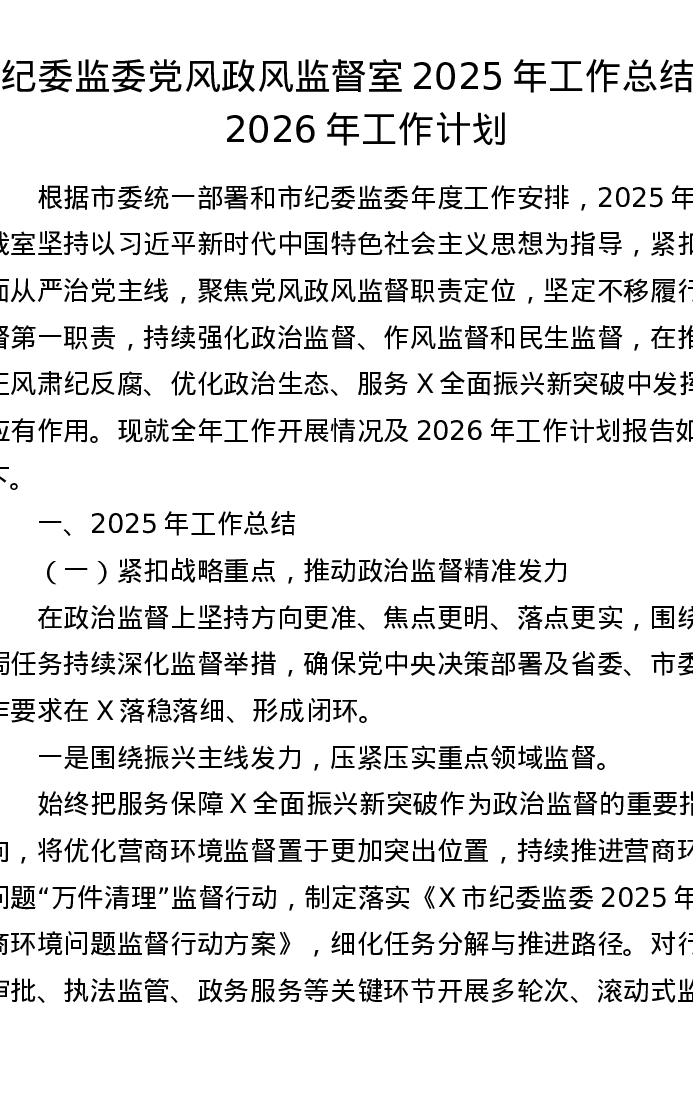 纪委监委党风政风监督室2025年工作总结及2026年工作计划