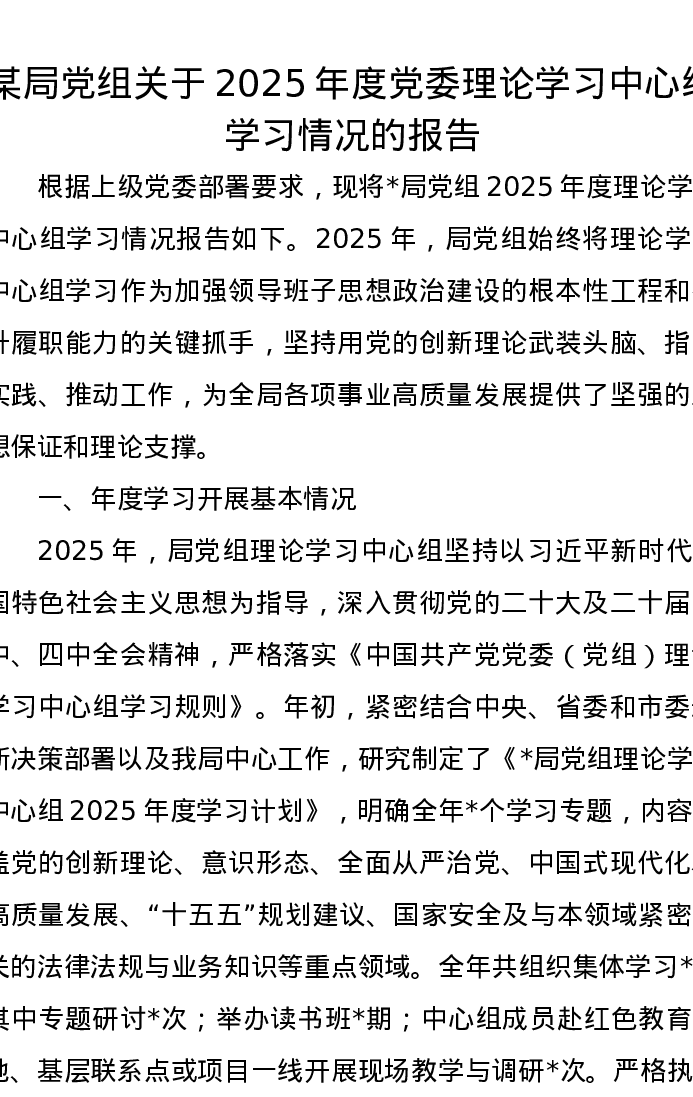 某局党组关于2025年度党委理论学习中心组学习情况的报告