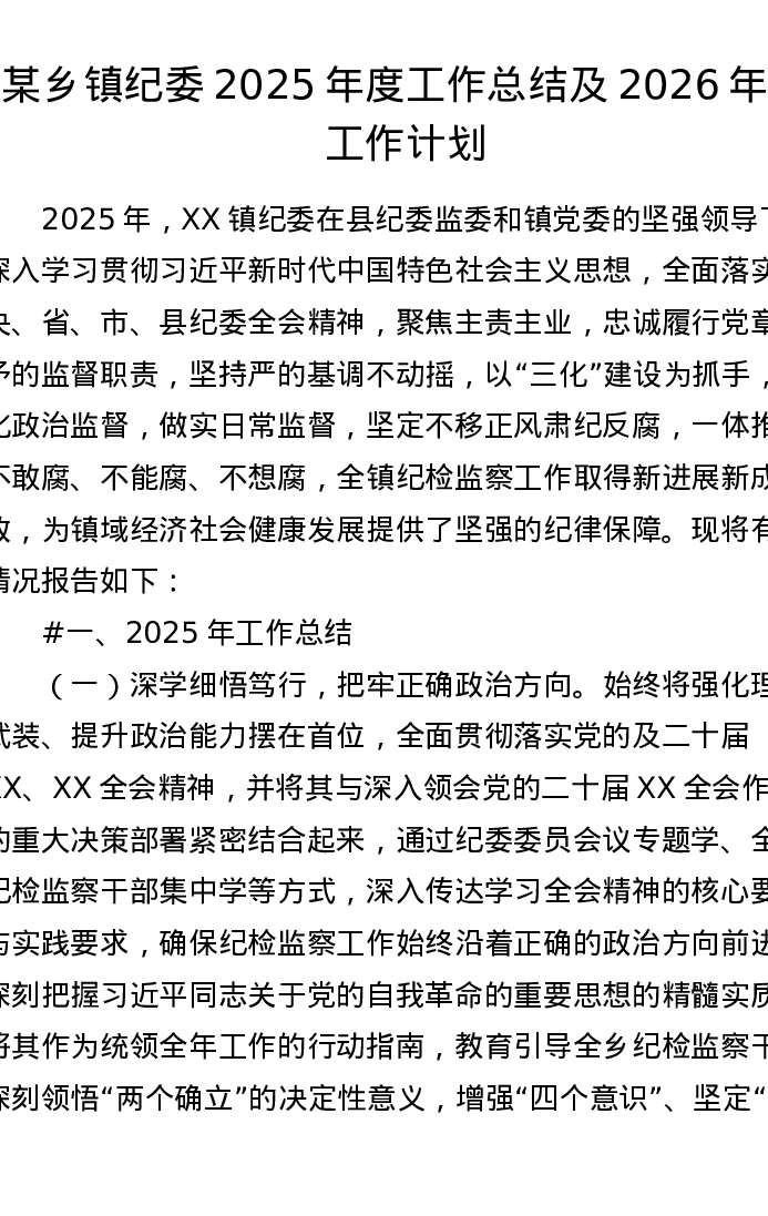 某乡镇纪委2025年度工作总结及2026年度工作计划(3998字)