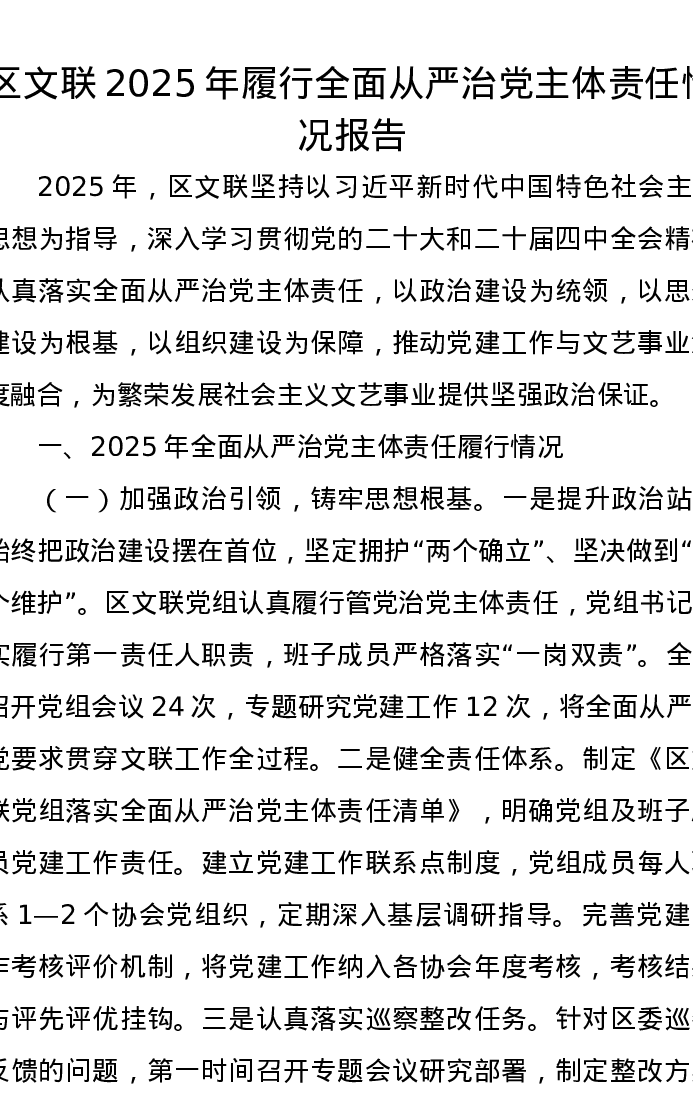 区文联2025年履行全面从严治党主体责任情况报告